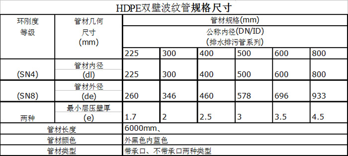 詳情頁HDPE雙壁波紋管是一種具有環(huán)狀結(jié)構(gòu)外壁和平滑內(nèi)壁的新型管材。以高密度聚乙烯為原料,具有重量輕、耐高壓、韌性好、施工快壽命長等特點,其優(yōu)異的管壁結(jié)構(gòu)設(shè)計,與其他結(jié)構(gòu)的管材相比,成本大大降低。并且由于連接方便、可靠,在國內(nèi)外得到廣泛應(yīng)用。大量替代混凝土管和鑄鐵管。 它可以通過短管與檢查井直接連接,即直接進(jìn)行塑料井或磚砌或者混凝土模塊井檢壁中,因管材外壁有環(huán)狀棱紋,具有止水止退的作用。對于淤泥土質(zhì)或流砂層土質(zhì)的地段應(yīng)作過渡段回填土,以保證施工質(zhì)量。